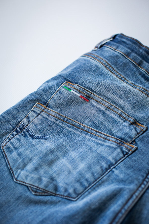 Jeansy motocyklowe ITALIA to kolejna gwiazda naszej „włoskiej” kolekcji. Model wykonany z materiałów z elastanem. Znajdziemy tu charakterystyczne elementy, takie jak podwójne tylne kieszenie. Ciekawie zaprojektowana forma piątej kieszeni (z bocznym otworem - nie górnym). Mix tych elementów składa się na niebanalny, nowoczesny styl. [readmore]
